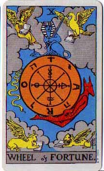 Another very interesting card. On this card we have four creatures surrounding three in the center on a revolving wheel .On the Waite Tarot deck you will see the word Taro or Rota on the wheel depending on how you look at it. Under the letters are astrological glyphs for T(Taurus), A(Not Sure), R(Aquarius) and O (not sure). Also on the wheel is the Tetragrammaton.... or the name of the Hebrew god Jehovah/Yahweh. The four creatures appear to be the four creatures of Revelation and Ezekiel. An angel/man/serpent, an eagle, a bull and a lion. On the Waite Tarot deck these four creatures are studiously at work reading something. In the mean time three creatures are fixed to the rotating wheel of TARO or YHWH. The wheel possibly indicates the revolutions of time within eternity. On the wheel are a snake(Horus?), on the descent... (I have ruled). And ass-headed Seth on the uprise (I shall rule). The two chase each other endlessly. At the top of the wheel sits the enlightened Sphinx (I rule). On some cards underneath the wheel is a a man on all fours supporting it (I am without rule). The sphinx to his benefit or detrement sits as master atop the wheel and outside of it. He wears the royal Egyptian headress striped with black and white showing his mastery of duality.