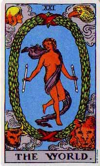 This card has many names... Eve, Shekina, Sophia, Mother Nature, Truth, the Bride, the System, Major Fortune, Anima Mercury, the Universe, and The World. On this card we often see either a woman or an adrogyne encirled by a wreath. The four creatures are in the corners of the card but there is a difference. The four creatures are no longer studying the books. They are now at rest... peace. In some cards they are represented as looking outwards... into the world. Whereas on the Wheel of Fortune card they had either been reading something or looking inwards. The wheel is no longer revolving... it like the creatures and the woman inside are at rest. She has come to the center of her own existence and her own unique experience of life. The dog no longer chases its tail. Dog and tail have become one.The conscious and the unconscious are in communion. The sacred marriage has been achieved. Never "born" and never "dying"... never coming, never going, no beginning(Alpha) and no end(Omega) she dances the dance of LIFE.