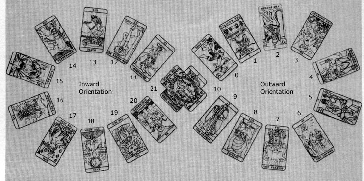 Some time during the 13th century there appeared a strange deck of cards called the Tarot. The Tarot deck is probably the forerunner of the modern playing card deck. A close examination of the Tarot reveals that it has elements of astrology, Kaballah, numerology, alchemy, magic, mythology, Egyptology, Christian mysticism and Eastern philosophy. In a nutshell it is densely saturated with esoteric wisdom. The Tarot deck as we have it now is composed of two parts: The Major Arcana(The Greater Secret) and the Minor Arcana (The Lesser Secret) which is probably the source of present day playing cards. The word Tarot may mean "wheel" or "royal way". What are these cards about? We will never know for sure since the creators are long dead... but there are some hints. Enough chatter; let's look at the Major Arcana(the Major Secret) and see if we can find any clues to its mystery. Here are the cards of the Major Arcana in its infinity spread. Notice how card 10 (The Wheel of Fortune) and card 21 (The World) are mated. This spread is known as "The Wheels of Becoming."